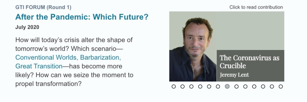 “The coronavirus outbreak has disrupted our lives, equanimity, and assumptions. . . The pandemic is a rupture in historic time that shakes the continuity of institutions and consciousness. . . How can we seize the moment to steer toward the Great Transition we all hope for and know to be possible?